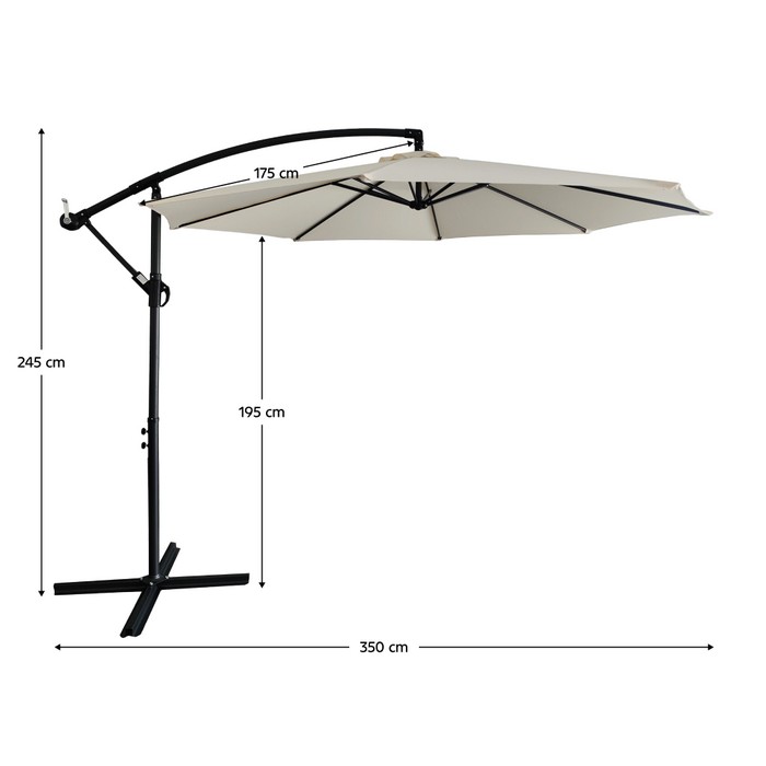 Záhradný slnečník LUKAN vytvorí príjemné tienisté miesto, kde si môžete naplno vychutnať oddych na záhrade, terase alebo balkóne. Poskytuje spoľahlivú ochranu pred ostrým slnkom aj ľahkým dažďom a zároveň dotvára exteriér moderným a elegantným vzhľadom. Kombinácia čiernej konštrukcie a béžovej striešky pôsobí nadčasovo a jednoducho sa prispôsobí rôznym štýlom vonkajšieho zariadenia. Konštrukcia slnečníka je vyrobená z ocele s čiernym práškovým náterom, ktorý zvyšuje odolnosť voči poveternostným vplyvom. Strieška je osadená na hliníkovej konštrukcii s ôsmimi pevnými ramenami s dĺžkou 175 cm, ktoré zabezpečujú stabilitu a rovnomerné napnutie látky. Poťah tvorí vodoodolný a UV odolný polyester s gramážou 180 g/m2, vďaka čomu je odolný voči slnečnému žiareniu aj dažďu. Slnečník má priemer 350 cm a celkovú výšku 245 cm, pričom výška po spodnú hranu striešky dosahuje 195 cm. Jednoduché otváranie a zatváranie zabezpečuje praktický kľukový mechanizmus. Pomocou rukoväte je možné nastaviť výšku aj uhol sklonu striešky podľa aktuálnej polohy slnka. Stabilitu zabezpečuje kovový rám v tvare kríža s priemerom hlavnej tyče 4,8 cm, ktorý je určený na upevnenie k pevnému podkladu pomocou pripravených otvorov. Pri umiestnení na trávnik alebo mäkký povrch je možné použiť univerzálne závažie na slnečníky, ktoré však nie je súčasťou balenia. Vetrací otvor v hornej časti striešky napomáha cirkulácii vzduchu a zvyšuje stabilitu počas používania. Je ideálny doplnok pre pohodové letné posedenie, pričom sa odporúča nevystavovať ho búrke, silnému vetru ani víchrici.