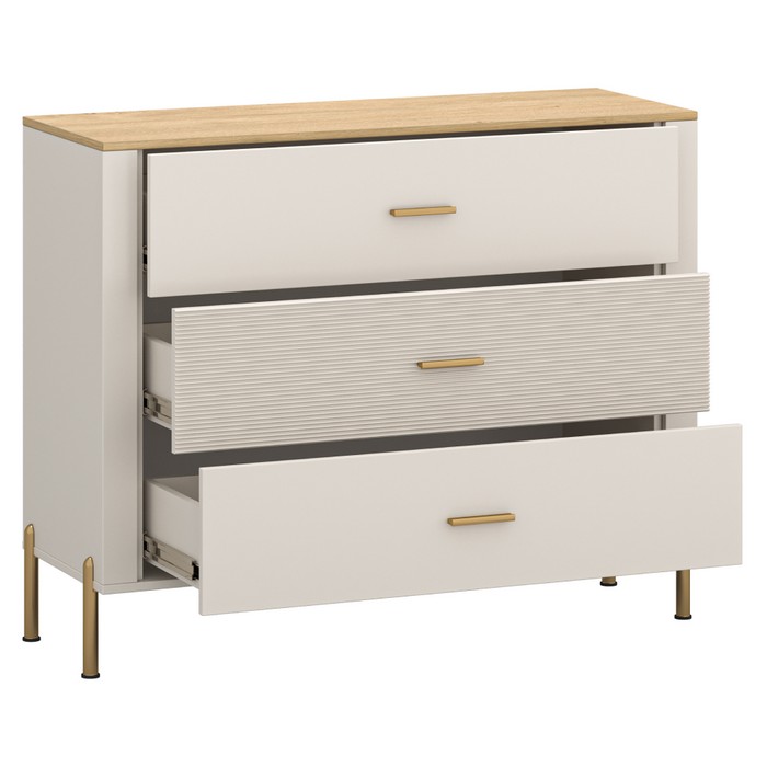 Komoda RUNOL 3S je praktickým riešením pre každodenné uskladnenie a ponúka tri priestranné šuplíky, ktoré poskytujú dostatok miesta na oblečenie, dokumenty či drobné doplnky. Všetky šuplíky sa pohodlne otvárajú pomocou pevných kovových úchytiek v zlatej farbe, ktoré dodávajú nábytku štýlový a elegantný nádych. Komoda je vyrobená z kvalitnej DTD laminovanej v kombinácii s fóliovanou MDF/PVC, čo zabezpečuje jej pevnosť a jednoduchú údržbu. Moderné farebné prevedenie kašmír/dub kamenný pôsobí harmonicky a ľahko zapadne do súčasných interiérov. Celkové rozmery komody sú (ŠxHxV): 116x42,3x93,5 cm a hrúbka materiálu dosahuje 1,6 cm. Každý zo šuplíkov má nosnosť 3 kg, čo je ideálne na odkladanie bežných predmetov. Komoda stojí na kovových nožičkách v zlatej povrchovej úprave, vysokých 15 cm, vďaka ktorým pôsobí vzdušne a uľahčuje upratovanie pod nábytkom. Predná časť je doplnená o dekoratívne frézovanie, ktoré podčiarkuje celkový moderný dizajn. Pre vyššiu stabilitu odporúčame komodu pripevniť k stene. Dodáva sa v demonte, pričom montáž je jednoduchá a prehľadná.