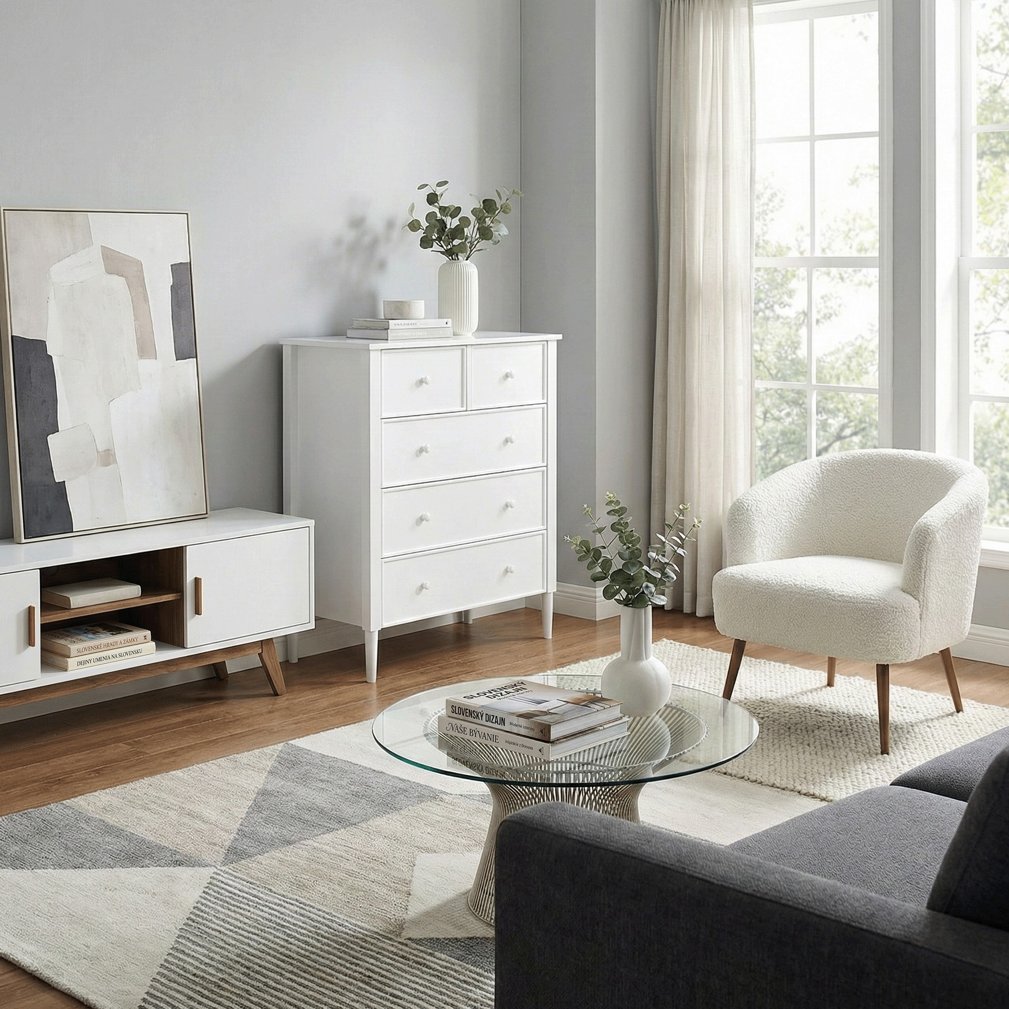 - Moderný vzhľad komody sa hodí do každého interiéru, pričom jej svetlá biela farba opticky zväčšuje priestor.
