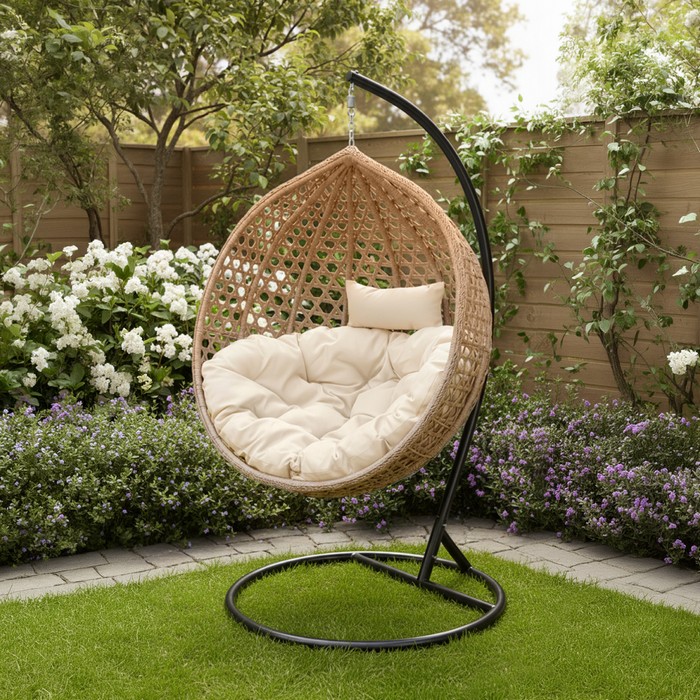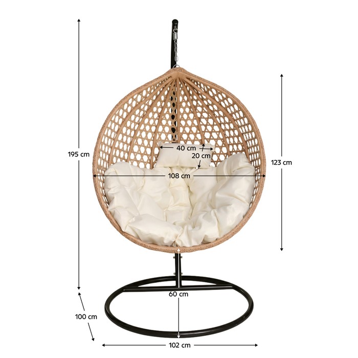 Doprajte si dokonalý relax v závesnom kresle EREN, ktoré sa stane štýlovým aj pohodlným doplnkom interiéru či terasy. Elegantná kombinácia čiernej ocele, béžového technického ratanu a mäkkých krémových vankúšov vytvára moderný, nadčasový vzhľad, ktorý ľahko zapadne do rôznych priestorov. Stačí sa usadiť, jemne sa pohojdať a vychutnať si chvíle pokoja pri knihe alebo obľúbenom nápoji. Kreslo je vyrobené z ocele, technického ratanu a kvalitnej látky s vysokou oderuodolnosťou 95 000 cyklov podľa testu Martindale. Celkové rozmery sú (ŠxHxV): 108x100x195 cm, samotné „vajíčko“ má rozmery (ŠxHxV): 108x70x123 cm. Výška sedu je 60 cm, hĺbka sedu 64 cm a priemer podstavy 102 cm, čo zaručuje stabilitu a komfort. Nosnosť kresla je 150 kg. Súčasťou balenia sú mäkké vankúše s vodoodolnými poťahmi, ktoré sú snímateľné a vybavené zipsom. Poťahy odporúčame prať ručne pri teplote 30 °C, nebieľiť, nesušiť v sušičke, nečistiť chemicky ani nežehlit. V exteriéri je vhodné kreslo chrániť krytom alebo plachtou. Kovanie pre závesné kreslo je umiestnené priamo v ráme kruhu a produkt je dodávaný v demonte.