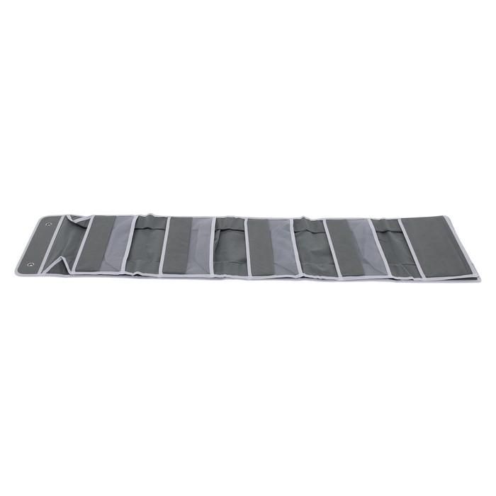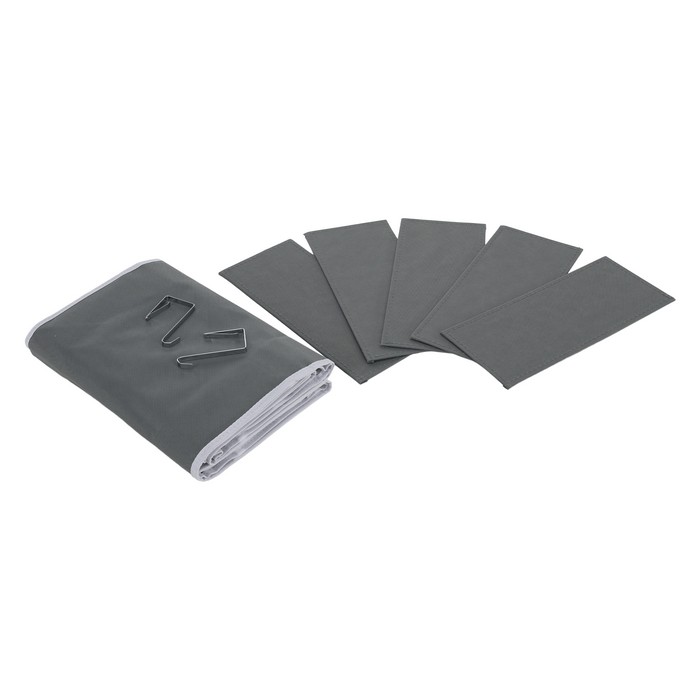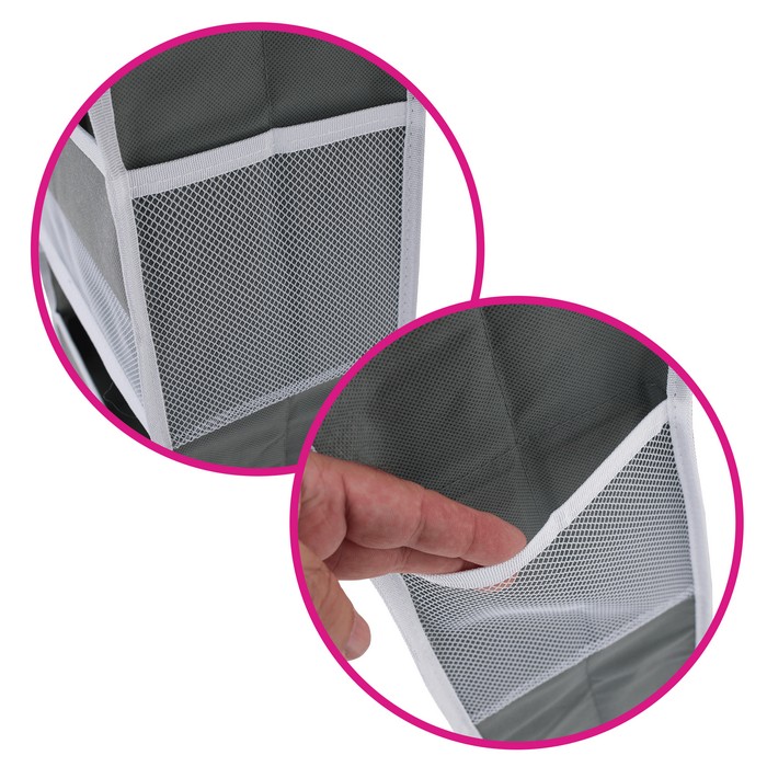Závesný organizér MADON je vyrobený z kvalitnej látky v neutrálnej sivej farbe. Má rozmery (ŠxHxV): 38x17x146 cm a ponúka päť priestranných priehradiek na prehľadné uloženie rôznych predmetov. Dopĺňajú ho praktické bočné vrecká, ktoré poskytujú ďalší úložný priestor na drobnosti. Organizér je vhodný do kúpeľne, detskej izby aj spálne a vďaka závesnému prevedeniu šetrí miesto. Je praktickým riešením na organizáciu domácnosti a dodáva sa spolu s háčikmi na jednoduché zavesenie.